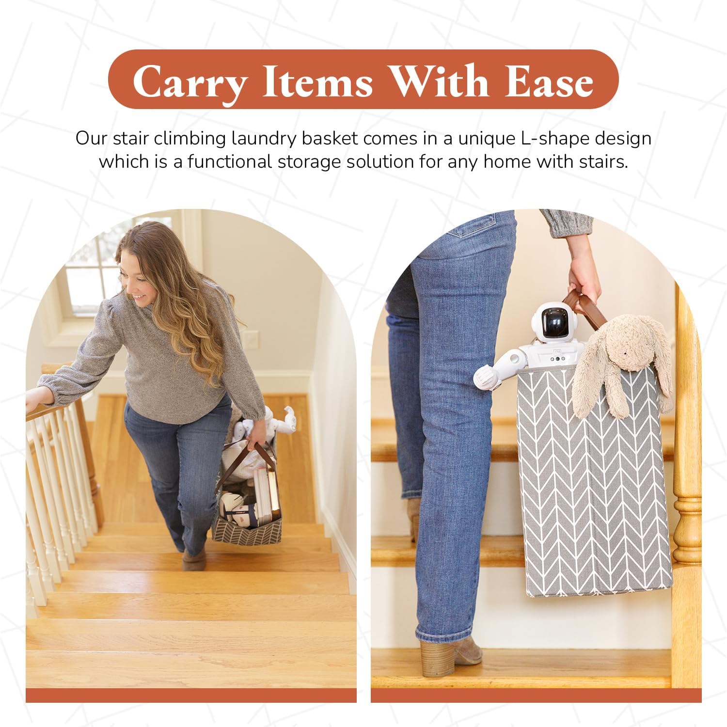 Universal Fit: Our stair climbing laundry basket comes in a unique L-shape design which is a functional storage solution for any home with stairs. The grey stair basket organizer measures 16” x 9.4” x 16”.