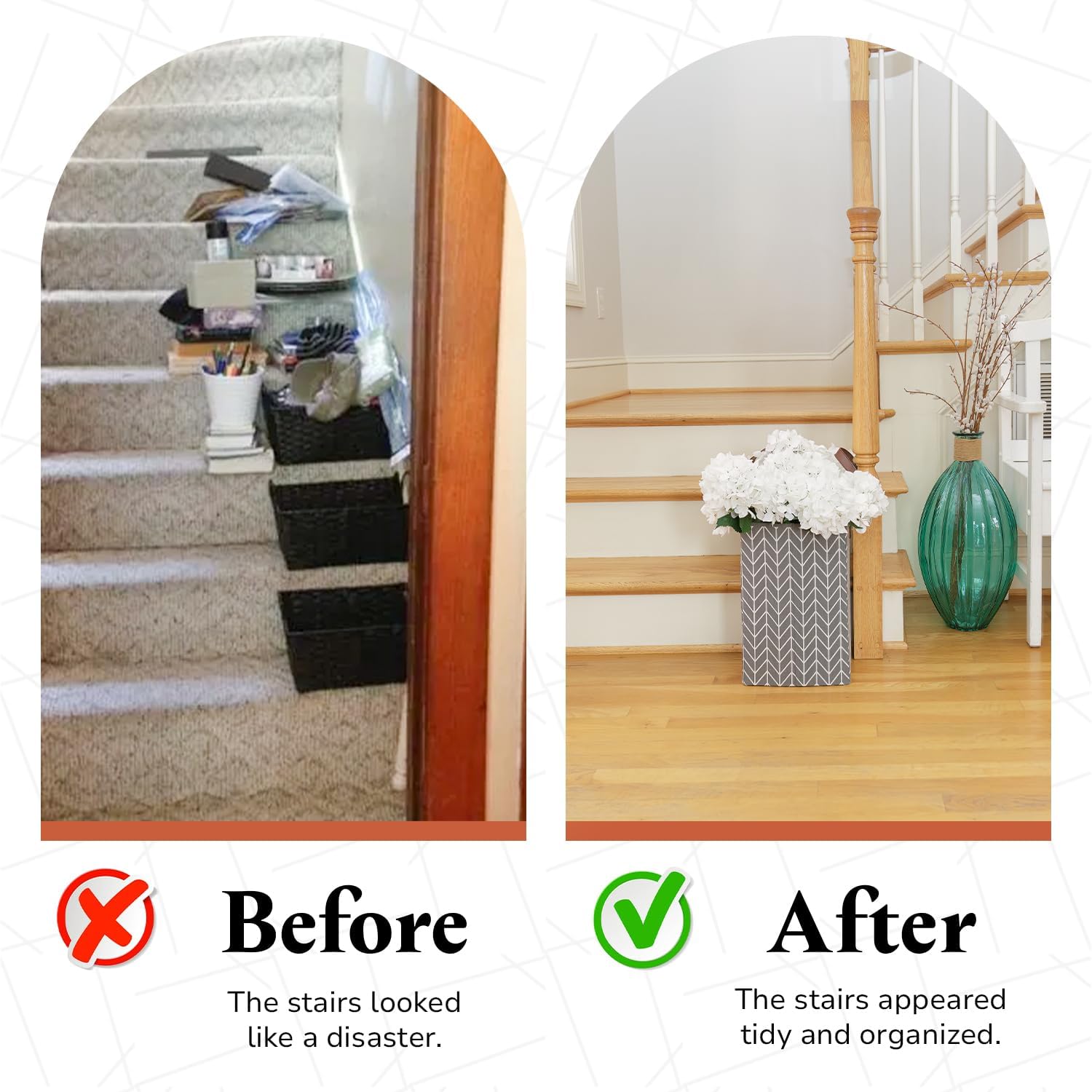 Stair-Specific Storage: Our exclusive L-shaped stair basket elevates the home organization to new heights. Its precise fit effortlessly turns stairs into smart storage spaces. With durability and captivating appeal, this must-have accessory adds elegance while keeping essentials organized.